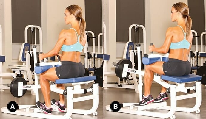 Для выполнения этого упражнения потребуется специальный тренажер для прокачки икр ног, который есть в каждом спортивном зале. Он представляет собой своеобразный стул с небольшой платформой для ног и специальным стержнем, на который по мере тренированности разрешается надевать утяжелители, постепенно увеличивая их количество.