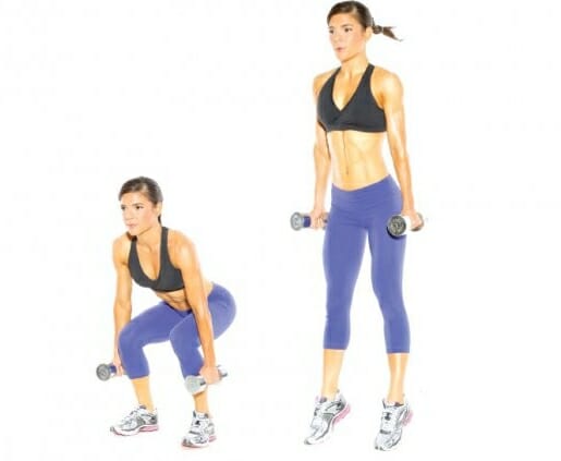 Важно следить за тем, чтобы спина была ровной, не округлялась в области грудного отдела позвоночника и не прогибалась в пояснице. Для мужчин разрешается вес в 5 кг для каждой руки, женщинам достаточно 1-2 кг. Выполнять от 10 до 20 раз в зависимости от уровня подготовки.