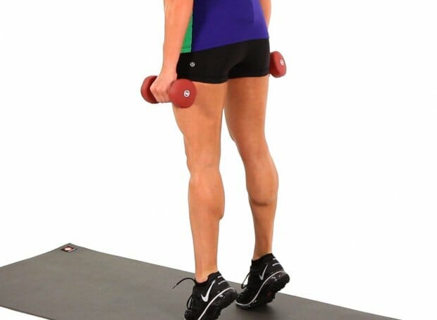 Упражнение подойдет мужчинам и женщинам, которые имеют достаточный уровень физической подготовки. Девушкам и новичкам лучше выбрать другой вариант. Выполняется аналогично приседаниям на носочках, но в каждую руку берется утяжелитель. При подъеме необходимо сделать пружинистое движение вверх по типу прыжка или даже слегка подпрыгнуть не сгибая при этом ног.