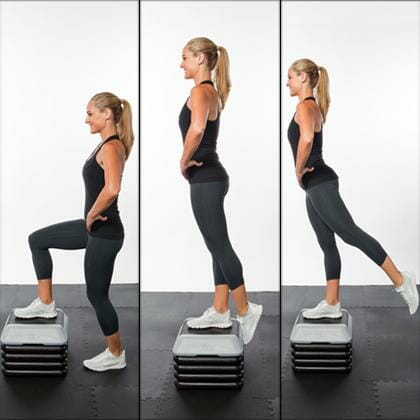 Универсальное и простое упражнение, которое подойдет подготовленным и неподготовленным людям. Выполняется на обычной платформе высотой 10-20 см: