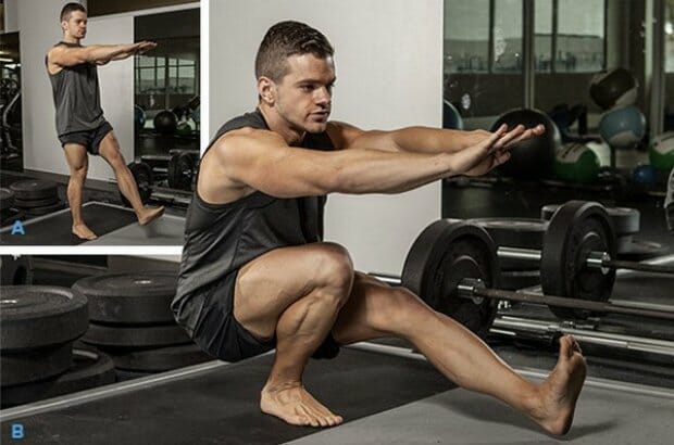 При приседании нога стоит на носочке. Это позволяет создать максимальное напряжение в области голеней. Упражнение подойдет мужчинам и женщинам со средним уровнем физической подготовки. Достаточно по 10 приседаний для каждой ноги.
