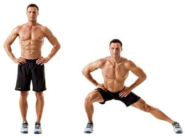 - Сделать выпад одной ногой в сторону. Вторая нога должна быть выпрямлена и стоять ступней на полу.