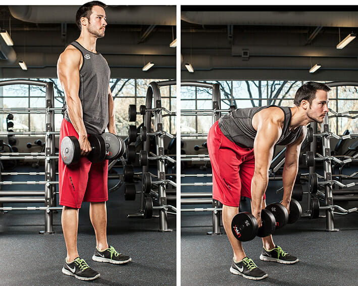 - Наклониться с гантелями, руки и ноги оставить прямыми.