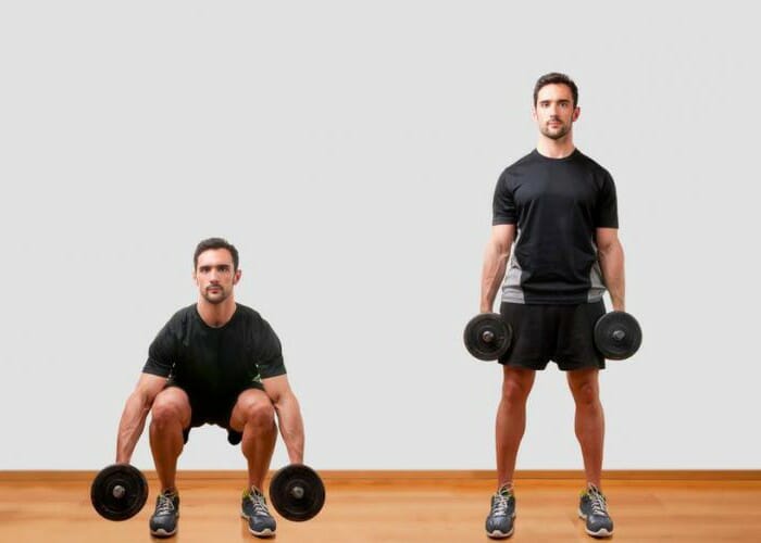 Упражнение подходит тренированным мужчинам и тем, кто только начинает заниматься. Выполняется аналогично обычным приседаниям, но в каждую руку во время выполнения берется гантель.