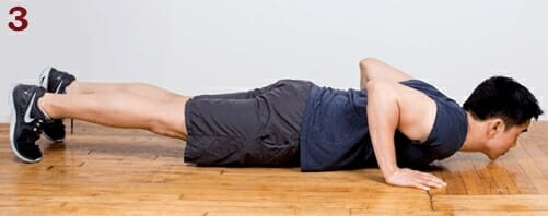 | Локти сгибают и касаются грудью пола, при этом корпус держат ровно. Можно делать отжимание без касания поверхности | |