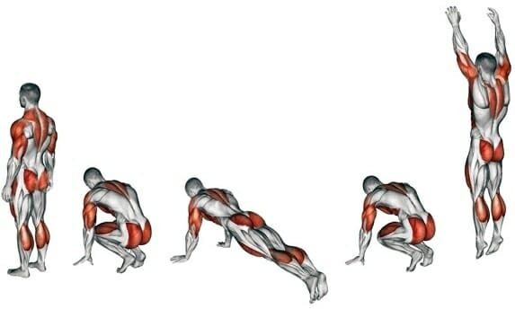 Суть заключается в комплексе последовательно выполняемых элементов (без остановок): присед, планка, отжимание и прыжок. Они выполняются в несколько подходов.