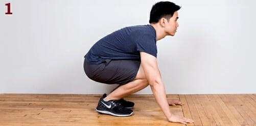 | Исходное положение — стоя, ноги на ширине плеч. Делают глубокий присед и опираются руками в пол. При этом бедра прижаты к икрам, голова на одном уровне со спиной | |