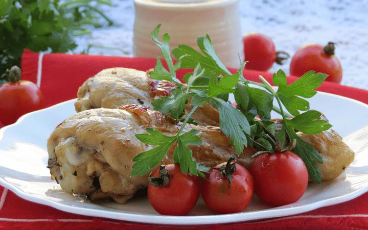 - Выложить куриные бедра в чашу мультиварки, посыпать помидором, луком и чесноком, залить кефиром.