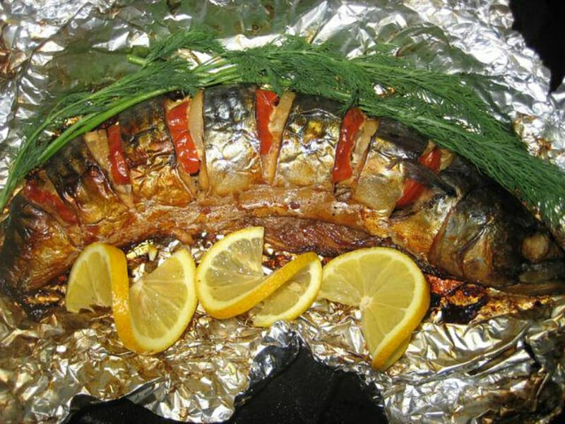 - Сделать надрезы в рыбе с внешней стороны, вставить в них полукольца овощей.