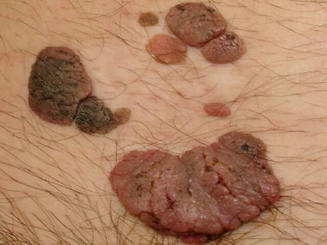 Возникают обычно у людей пожилого возраста. Края четкие, форма округлая, поверхность гладкая. Обычно светло-розовые или телесные, затем темнеют.