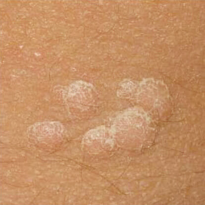 Чаще всего возникает у детей и подростков. Симптомы следующие: нарост неправильной формы немного возвышается на кожей, поверхность гладкая.