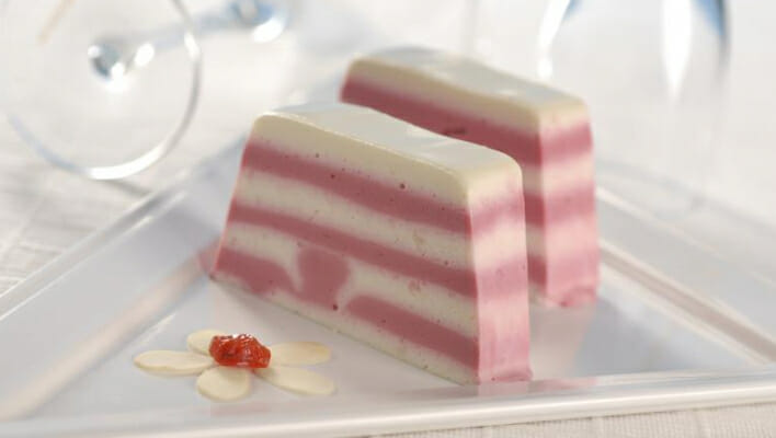 - Приступить к формированию десерта: поочередно наливать слои белого и розового цвета, выдерживая каждый из них по 15-20 минут в холодильнике.