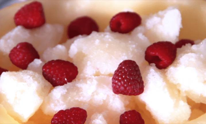 - Вынуть дынный сорбет из холодильника, переложить замороженные кусочки на общее блюдо или в креманки и украсить ягодами.