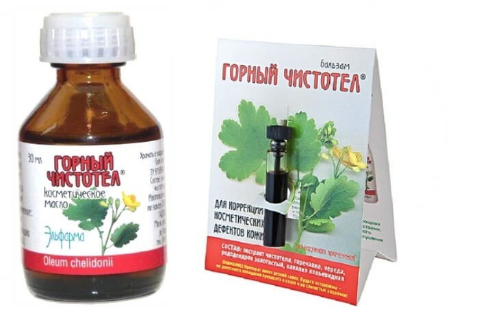 «Горный чистотел» — это название фармацевтического препарата, который выпускается в форме капель или бальзама. Средство продается в маленьких флакончиках с аппликатором. Также «Горный чистотел» может быть представлен в виде косметического масла в бутылочке по 30 мл.