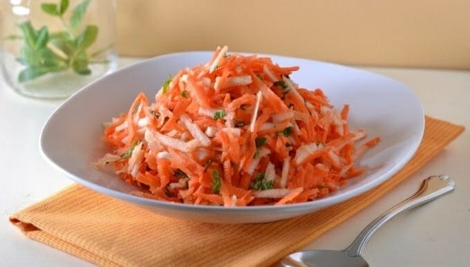 - Яблоко очищают от кожи и нарезают тонкими ломтиками, морковь измельчают на терке.