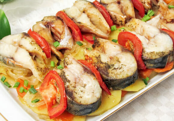 - Рыбу вместе с луком складывают в миску и заливают остуженным маринадом. Оставляют так на полчаса, затем запекают в духовке в течение 20 минут.