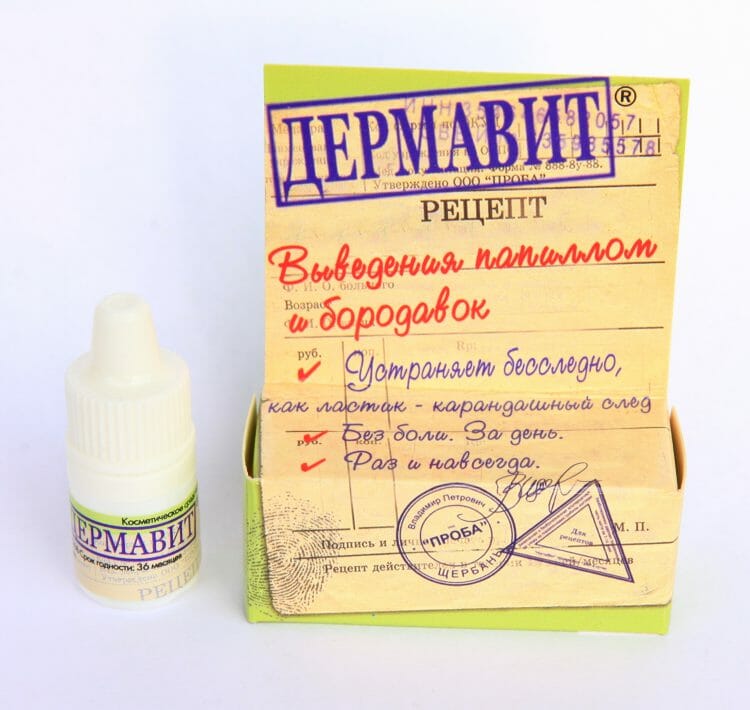Дермавит — многокомпонентный медикамент, который эффективно удаляет папилломы. Данный препарат справляется также с бородавками. Дермавит запрещено применять на лице, в области подмышек, молочных желез, в паху и на слизистой.