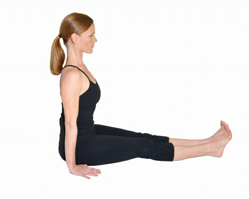 - Сесть, ноги прямые, вытянутые вперед. При этом угол между спиной и бедрами составляет 90 градусов. При выполнении упражнения нужно следить за осанкой — спина должна быть ровной (как на фото).