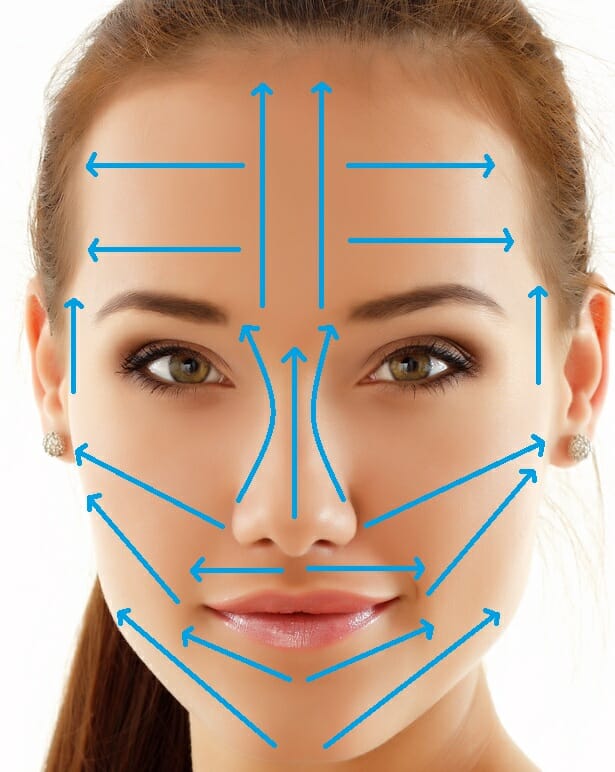 Проводить по массажным линиям следует указательными и средними пальцами обеих рук, располагая их на срединной линии лица и двигаясь к краю. Разрешается слегка надавливать, но не прилагать силу. После этого следует постукивать все лицо подушечками пальцев на протяжении минуты, чтобы завершить сеанс.