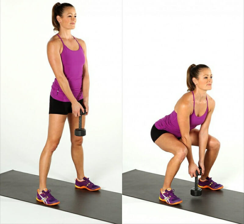 Упражнение нагружает одновременно ноги, ягодицы, нижнюю часть поясничных мышц и брюшной пресс. Чтобы акцентировать нагрузку именно на попе и бицепсе бедра, рекомендуется выполнять приседания после отведения ног назад или мертвой тяги.