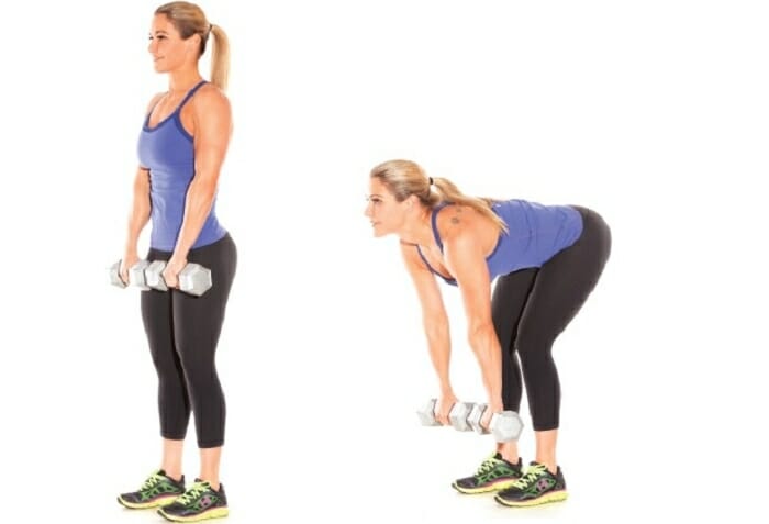 - Взять в руки 2 увесистых гантели и зафиксировать их на прямых руках в районе передней части бедер.
