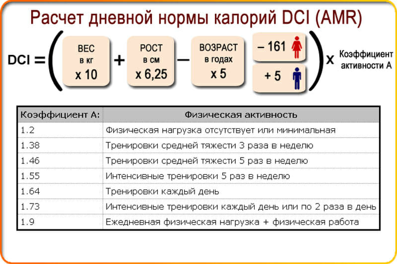Обязательно необходимо создать профицит калорий. Для этого нужно высчитать по приведенной ниже формуле, сколько калорий требуется для обеспечения жизнедеятельности организма и сохранения веса.