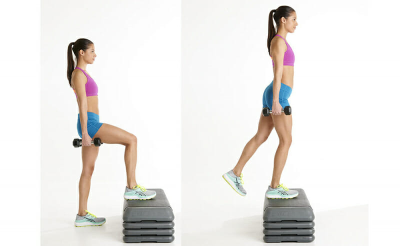 - Сохраняя вертикальное положение позвоночника, выполнить поочередное зашагивание на платформу правой и левой ногой.