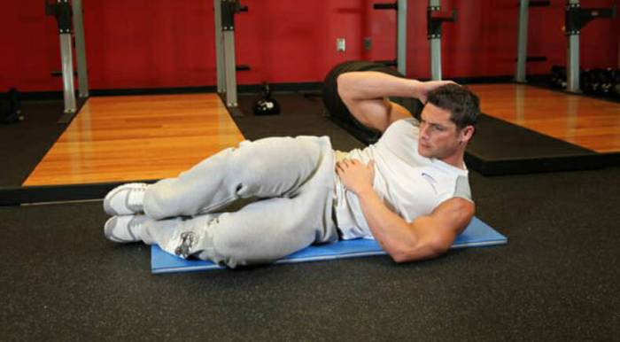 - Перевернуться на правый бок и повторить скручивания в противоположную сторону.