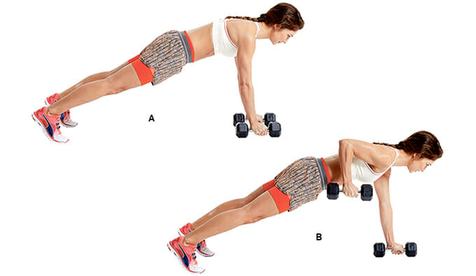 - Опустить снаряд на пол и, переведя на него массу тела, произвести тягу гантели в левой руке.