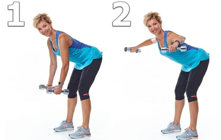 Для осуществления тяги понадобятся две гантели по 3-5 кг. Алгоритм выполнения: