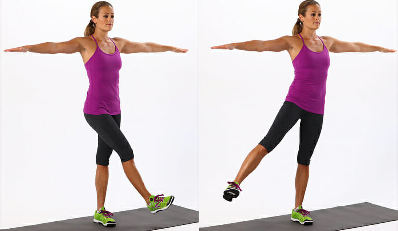 - Быстрыми, маховыми движениями выполнить 20 поднятий правой ноги вверх.