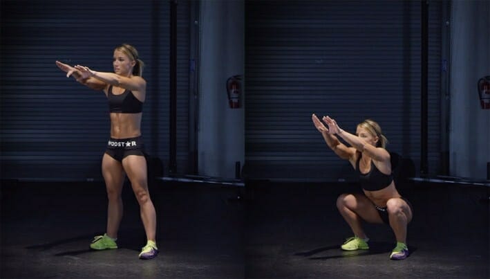 - Во время вдоха плавно опустить корпус в позицию полуприседа (угол между позвоночником и бедрами составляет 90 градусов).
