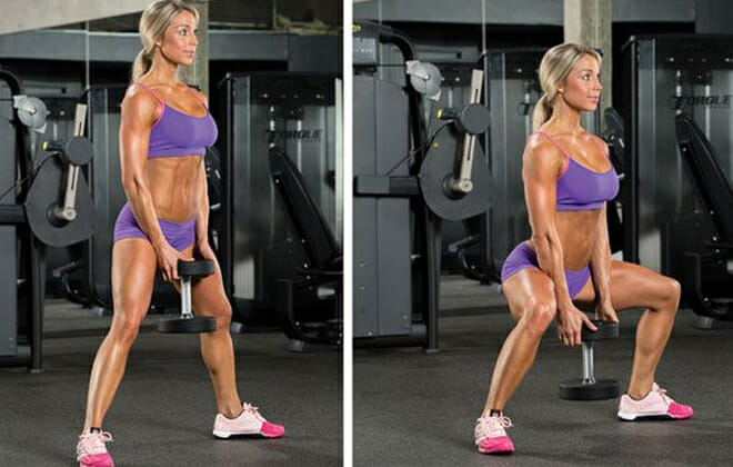 Главное отличие данного упражнения от классических приседаний заключается в широкой постановке ног. Такая техника позволяет сместить акцент нагрузки с передней части бедра на ее заднюю поверхность и ягодицы.