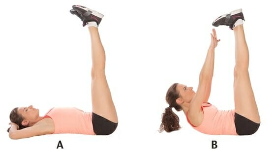 Одновременный подъем ног без отягощения подходит для людей со средней физической подготовкой.