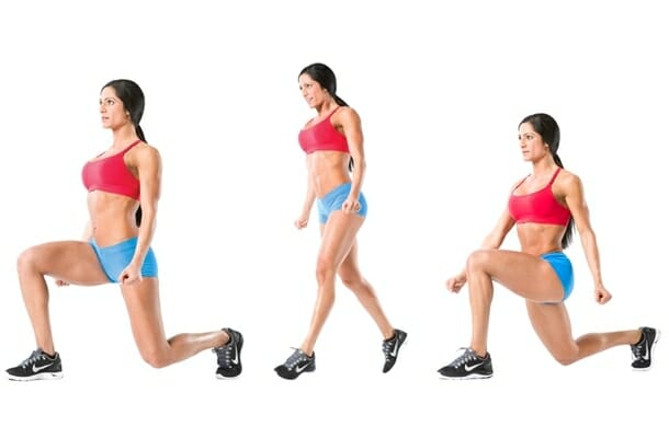 - Сделать выпад вперед, причем коленом задней ноги нужно практически доставать пол. Колено передней ноги не должно быть дальше, чем носок. Спину следует держать прямо, а ногу сгибать ровно под углом в 90 градусов, не выдаваясь вперед слишком далеко или слишком близко.