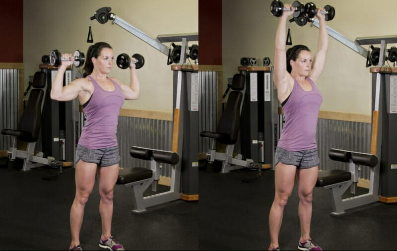 - Осуществляя выдох, быстро поднять гантели вверх.