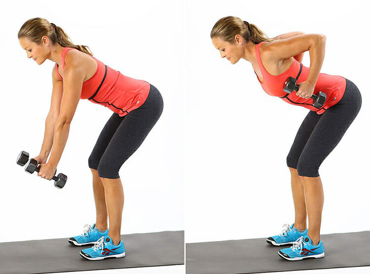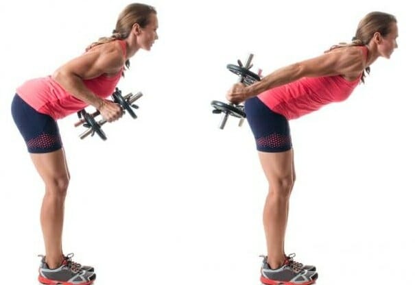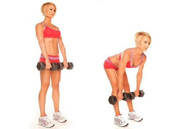 - На вдохе осуществить наклон корпуса вниз до образования прямого угла (гантели опускаются параллельно голеням).