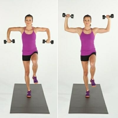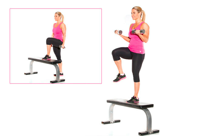 - Выполнить зашагивание левой ногой, после чего сразу поднять правое бедро и гантели на бицепс.