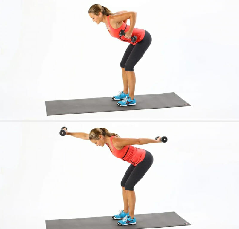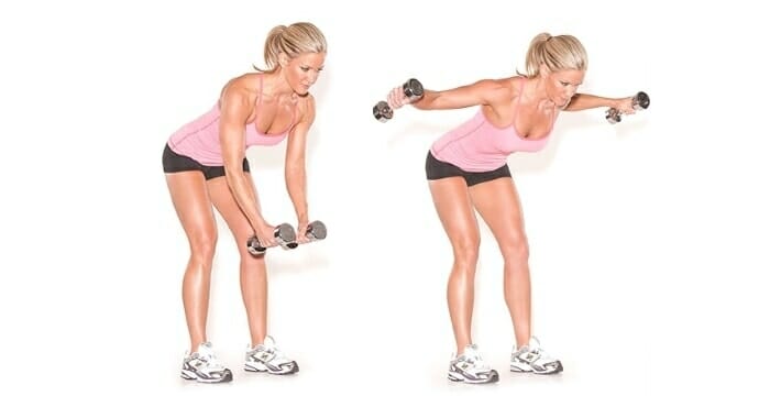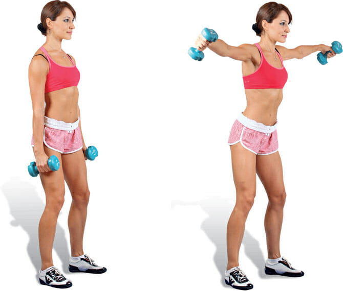 - На выдохе быстрым маховым движением развести гантели в стороны.
