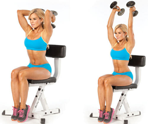 - На вдохе, удерживая плечи в неподвижном состоянии, опустить отягощение назад, за голову (сгибается только локтевой сустав).