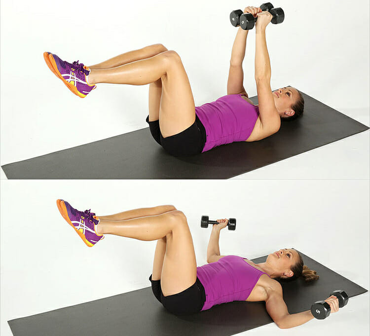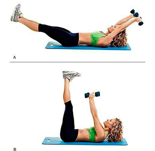 - Взять в кисти гантели и занять исходное положение: лечь на гимнастический коврик спиной вниз, свести голени вместе, приподнять ноги вверх под углом 35 градусов и вытянуть гантели за голову.