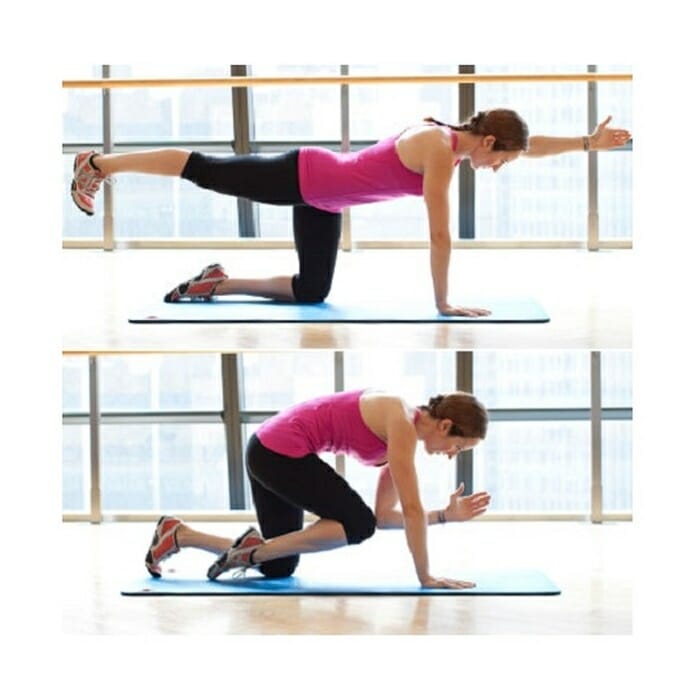 - Максимально напрячь мышцы ног и ягодиц и, держа спину ровной, совершить движение, при котором локоть и колено рабочих конечностей коснутся друг друга.