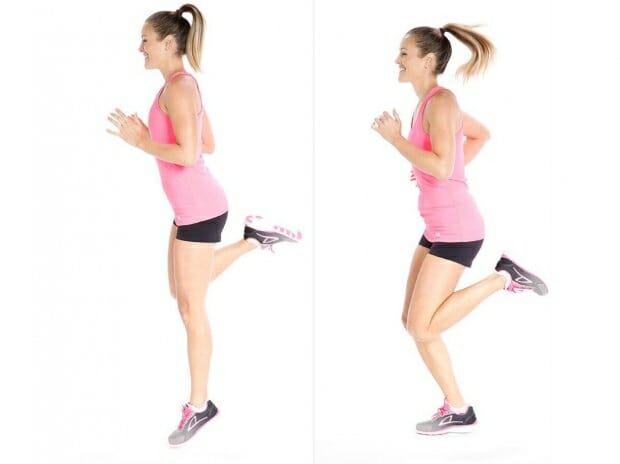 Интенсивное упражнение подходит для жиросжигающих тренировок. Суть его заключается в том, что нужно бежать на месте, максимально поднимая стопы вверх, — до касания ими ягодиц.