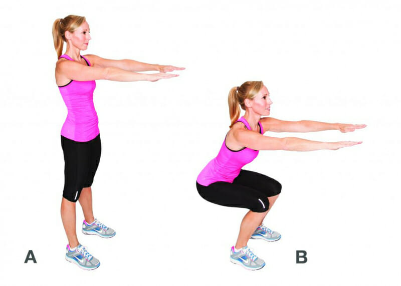 - Медленно приседать так, чтобы во время этого бедра располагались параллельно полу.
