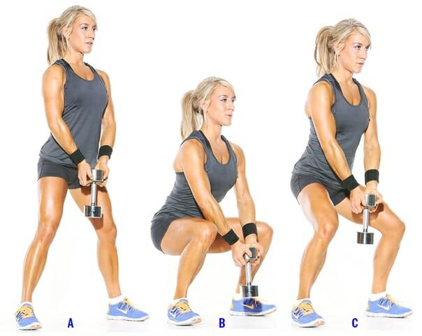Этот вариант приседаний также выполняется по классической технике, но руки не поднимаются перед собой. В них следует взять гирю или гантель весом 5 кг и держать ее между ног во время приседаний.