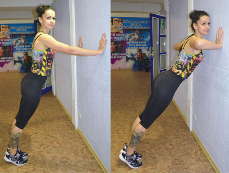 - Ладонями на уровне плеч опираются о стену, локти разворачивают в стороны. Нельзя сгибать ноги или прогибаться в пояснице во время этого упражнения.