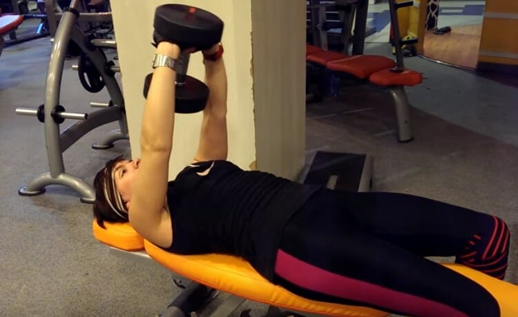 Лежа на скамье, можно прямые руки с одной гантелей заводить за голову — упражнение называется пуловер.