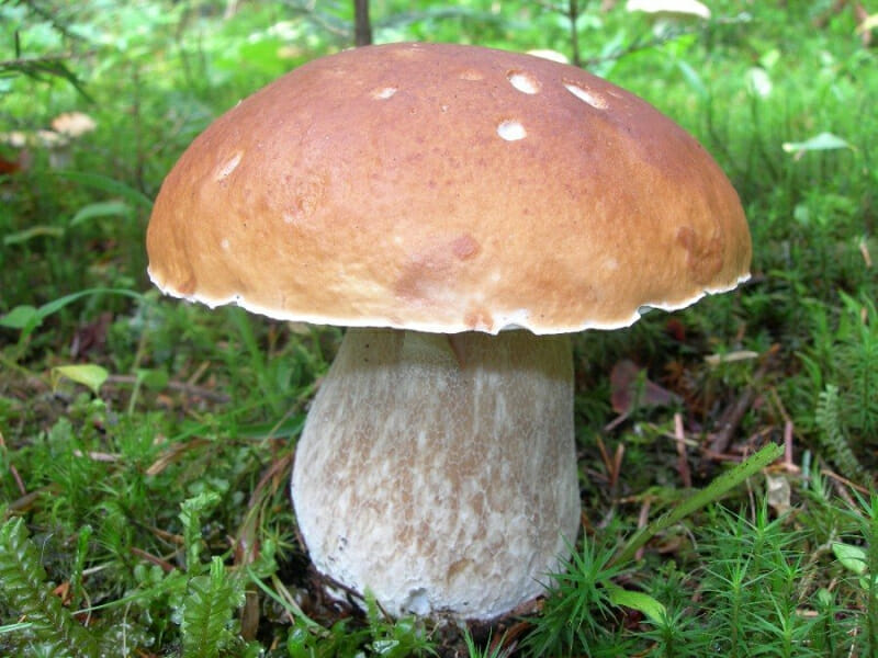 Белый гриб, или боровик, считается наиболее ценным видом гриба, поскольку обладает уникальными вкусовыми качествами и полезными свойствами. Вид довольно крупный, имеет сочную мякоть и вырастает до 15 см в длину при диаметре шляпки в 20 см. Растет под березами, дубами, соснами.