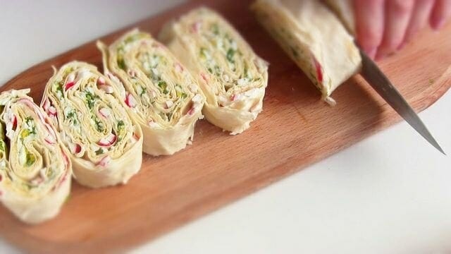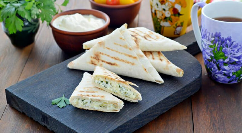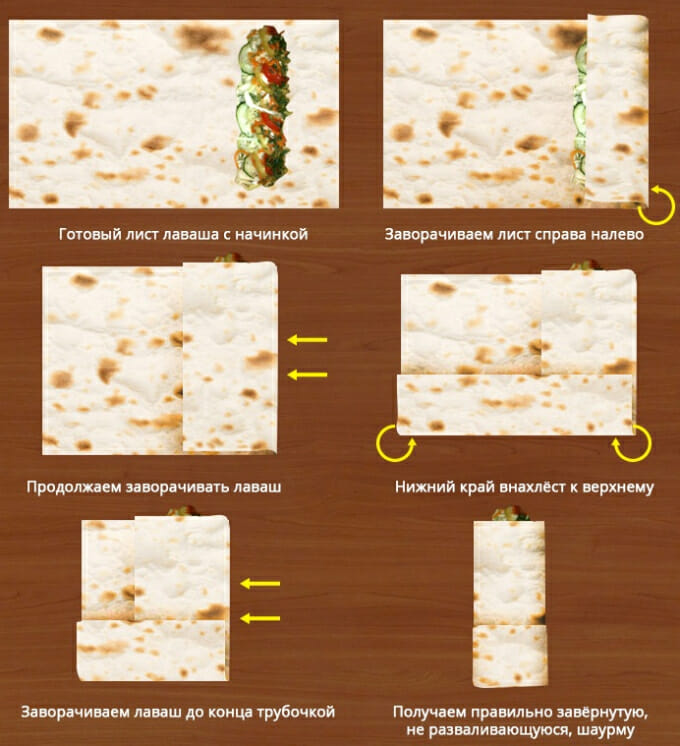 Любую из перечисленных начинок можно завернуть в лаваш, придав ему форму рулета, прямоугольника или треугольника, подавать в цельном виде или разрезать на небольшие порции.