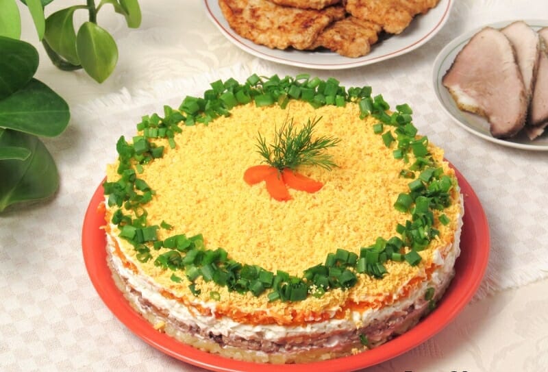 - Выкладывать в последовательности: белки, лук, сметана, тунец, яблоко, белки, сметана, яблоко, тунец, сметана, желтки.